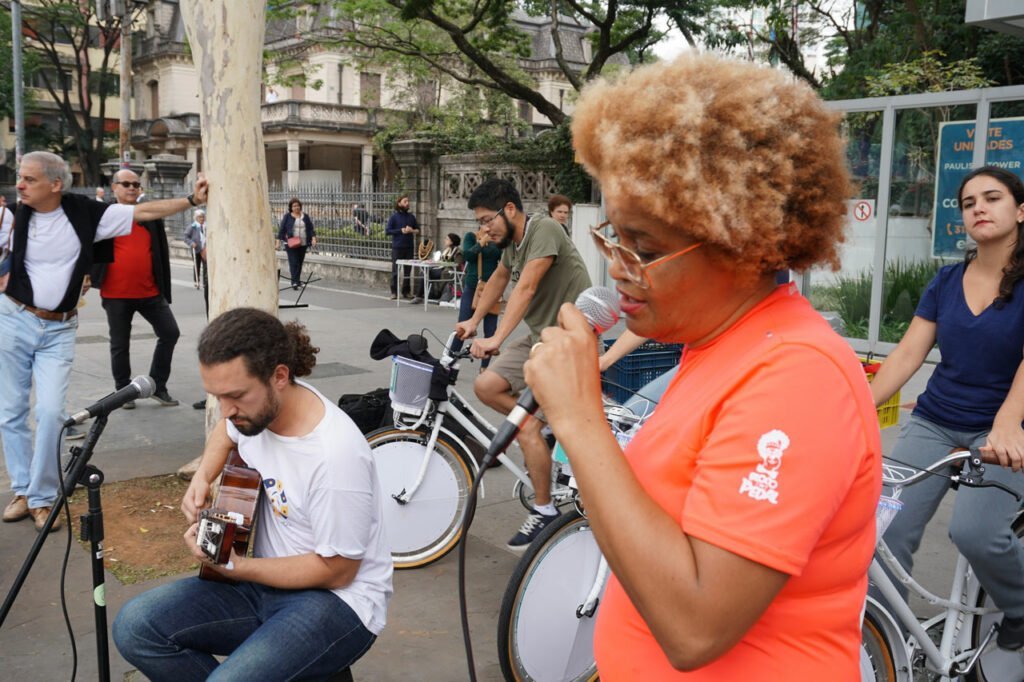 Utilizando bicicletas estacionárias, o público pedala e gera a energia que alimenta o som da música no palco